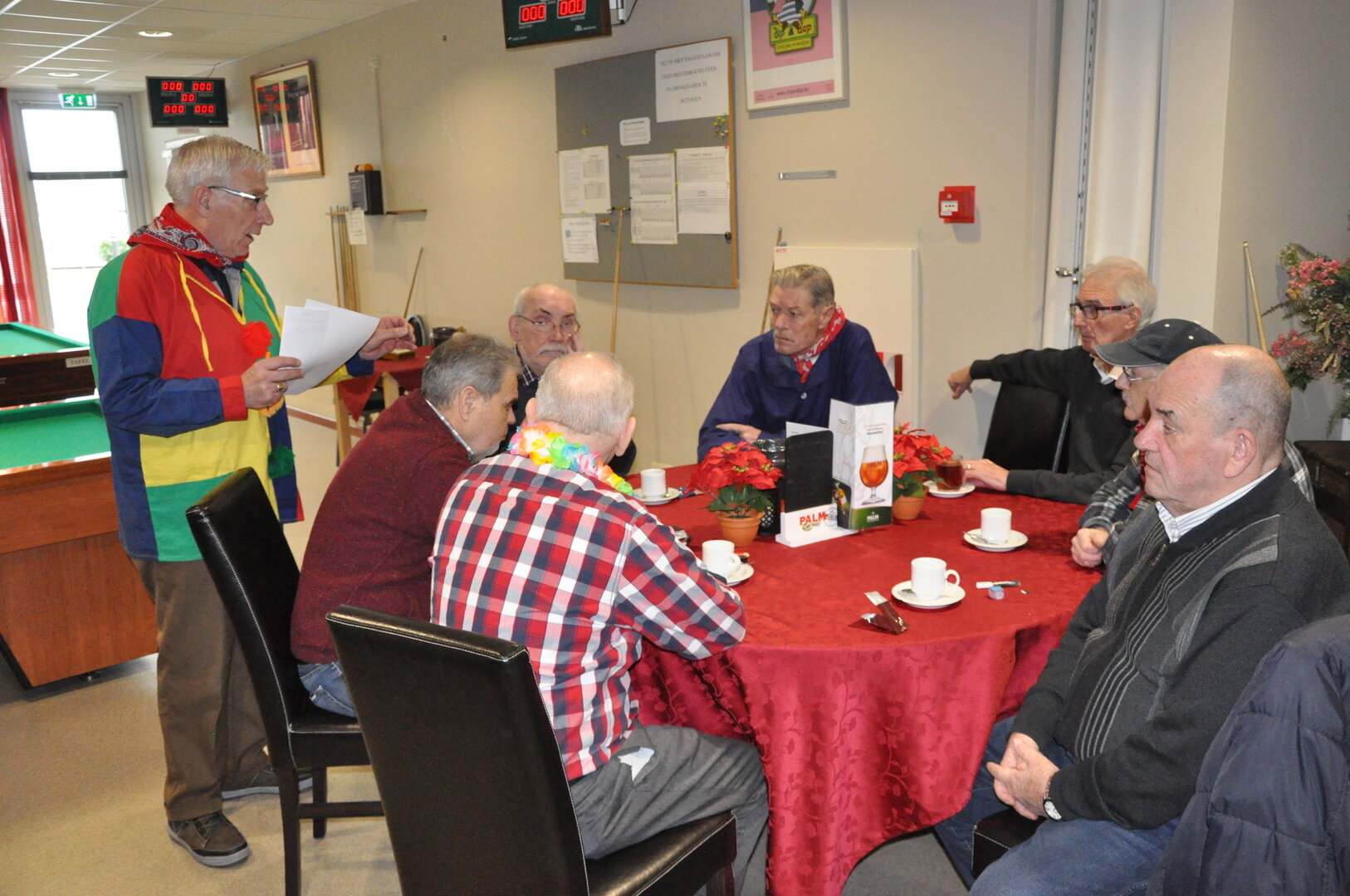 De mensen werden verdeeld volgens opgave aan het biljart, sjoeltafel en kaartafel.